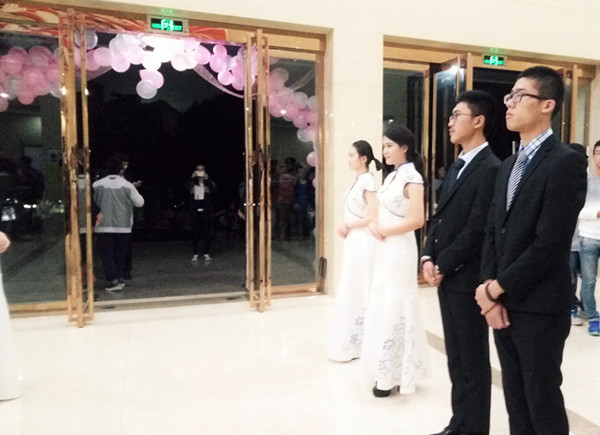 步入大厅,两旁是仪态端庄、安静优雅的礼仪人员。早在晚会开始正式之前,他们就已整装以待,以静默的姿态迎接热闹庆典的到来。“他们是很辛苦的。”女生部部长罗雅茜如是说。“排练过程中对仪表姿态要求非常严格,站姿坐姿、外表、发型、妆容都进行了严格细致的培训。尤其是女生,出礼仪时常会踏着高跟一站就是一个半小时,甚至忙到没时间吃饭。”